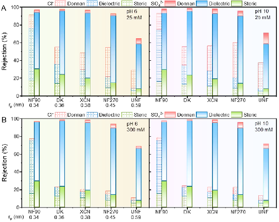 图4:基于等电点及其他pH条件下离子截留率的差异,量化空间位阻、Donnan排斥和介电排斥效应对离子排斥的贡献。(A)离子强度为 25 mmol/L(B)离子强度为300 毫mmol/L。