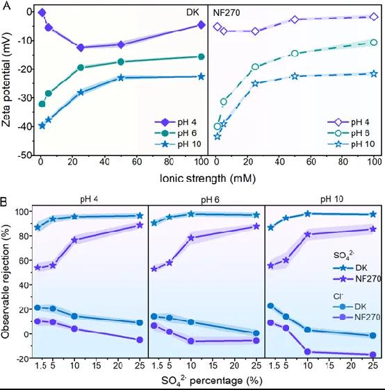 图2:(A)不同pH与离子强度下膜表面zeta电位变化规律(背景电解质溶液为NaCl/Na₂SO₄混合溶液,Na₂SO₄占比10%);(B)固定离子强度条件下离子截留率随pH值的变化规律。