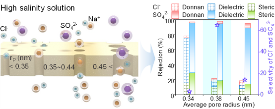 本研究表明,在高盐体系中,基于孔径调控的空间位阻效应与介电排斥效应共同构成 Cl⁻/ SO42-选择性分离的主导机制:无论膜表面电荷密度如何,0.35-0.44 nm 特征孔径是实现高盐体系 Cl⁻/ SO42-选择性分离的必要条件,这一发现凸显了孔径参数在溶质选择性分离中的关键作用。在荷电溶质的纳滤膜传输过程中,空间位阻与介电排斥效应构成离子截留的稳定作用机制,而 Donnan 排斥效应易受进料液物化性质的显著影响。研究揭示了在高盐体系中,基于溶质物化特性,设计具有精准孔径分布和适宜膜材料的纳滤膜,对于强化介电排斥效应、实现高盐体系溶质精准分离与资源回收至关重要。本项目得到了国家自然科学基金委和华能集团的资助