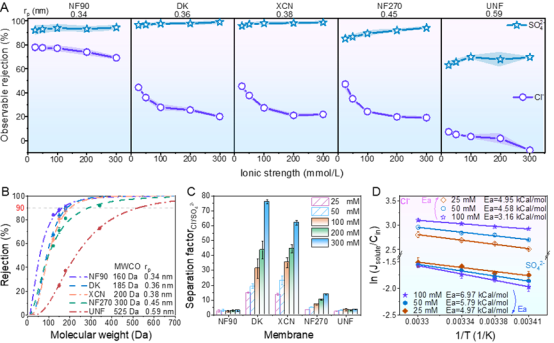 图1:商品纳滤膜离子截留与选择性分离性能。(A)溶液离子强度对离子截留率影响;(B)中性溶质截留性能;(C)不同离子强度下Cl⁻/SO42-分离因子;(D)离子跨膜传输能垒随离子强度与温度梯度的变化特性。