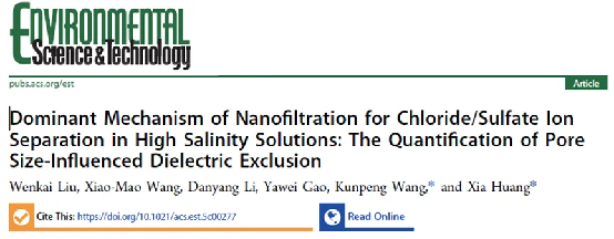 近日,清华大学环境学院黄霞教授团队在环境领域著名学术期刊Environmental Science & Technology上发表了题为“Dominant Mechanism of Nanofiltration for Chloride/Sulfate Ion Separation in High Salinity Solution: the Quantification of Pore-Size-Influenced Dielectric Exclusion”的论文。文中揭示了高盐溶液中介电排斥效应对于纳滤选择性分离Cl-/SO42-的重要贡献。相较于提升膜电荷密度,通过精准调控纳滤膜孔径以协同利用空间位阻与介电排斥效应,是实现高盐体系中单价/多价离子高效分离的重要路径,为面向高盐体系的纳滤膜结构设计与工业应用提供了理论依据。
