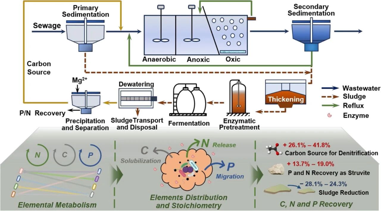 本研究分析了酶促厌氧发酵过程中碳、氮、磷的化学计量关系及功能微生物组的作用。结果表明,酶解预处理使污泥上清液中碳、氮、磷的释放量提高了21.8%-26.3%。宏转录组分析显示,酶解预处理强化了后续发酵中有机碳降解、氨转化和磷溶出的代谢过程。具体而言,酶解使内源碳水解酶活性提升48.4%-72.7%,并上调糖酵解、丙酮酸代谢等胞内碳代谢途径;氨转运与转化效率显著提高46倍,促进谷氨酰胺及内源氨基酸合成;同时,酶解刺激磷酸酶分泌并增强细菌对磷的摄取。这些效应使碳、氮、磷的回收率(作为反硝化碳源和鸟粪石)提升13.7%-41.8%,污泥干重减少24.3%~28.1%。生命周期评估(LCA)表明,相较于传统A²/O工艺,该工艺使CO₂排放由净正值转为净负值。本研究为酶促厌氧发酵中元素的再分配与代谢机制提供了新见解,并提出通过污泥生物精炼实现污水碳、氮、磷回收的潜在策略。