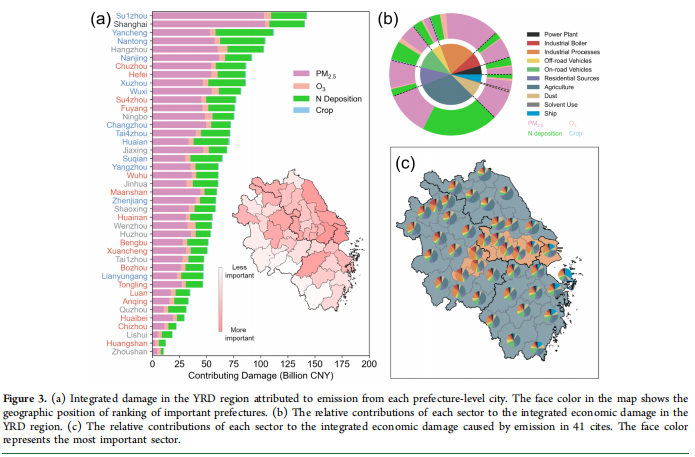 本研究旨在开发一个综合框架,系统评估空气污染对人类健康和生态系统的综合影响,量化本地排放与区域传输对整体损害的相对贡献,识别关键源城市和优先控制部门,为制定区域协同、多污染物控制政策提供科学依据。研究以中国长江三角洲(YRD)地区41个地级市为案例,采用响应面模型(RSM)模拟PM₂.₅、O₃浓度、氮沉降及O₃引起的农作物损失,并结合货币化方法量化健康与生态损害的经济价值。