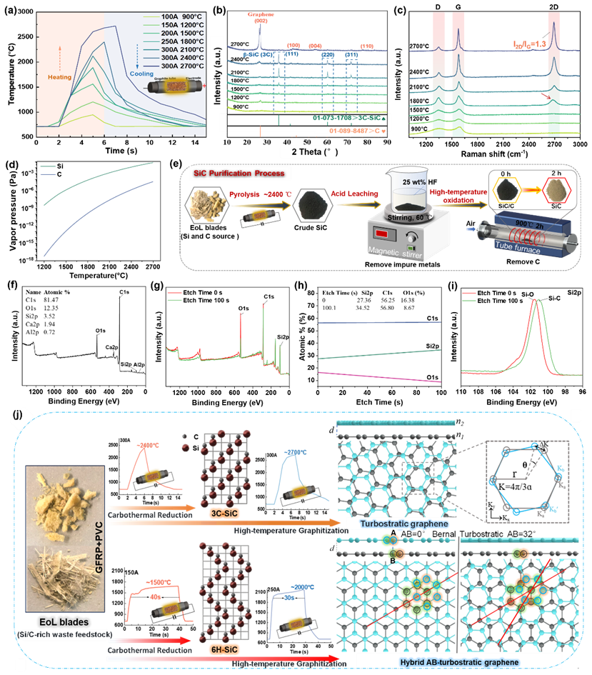 通过调控CTS工艺的温度与时间参数,实现了从同一GFRP-PVC混合废料中选择性合成不同结构的材料。如图1所示,通过精确控制输入电流,可在不同温度下分别制备出立方3C-SiC和高纯度涡轮层石墨烯。XRD与拉曼光谱证实了材料随温度升高的相演化过程:约2400°C时主要形成3C-SiC,而在2700°C时,硅的挥发导致SiC分解,石墨烯成为主导相。此外,研究还通过酸洗与高温氧化等多步纯化工艺,成功去除了金属杂质与表面氧化物,获得了纯度超过99%的高质量SiC。