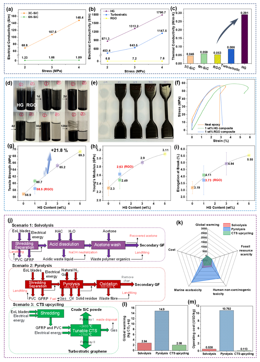 通过对CTS产物的结构与性能开展系统表征,研究进一步评估了所制备材料的应用潜力和可持续效益。结果发现,CTS合成的3C-SiC具有高比表面积和纳米多孔结构,适合用于污染物吸附和催化等环境应用;相比之下,乱层石墨烯则表现出优异的电导率、热稳定性和分散性。在功能性能测试中,3C-SiC的电导率显著高于6H-SiC,而6H-SiC在热导率方面更具优势。对于杂化石墨烯,将其以5 wt.%的负载量添加进环氧树脂基体中,可使复合材料的拉伸强度提高21.8%,并且分散稳定性保持超过120天,性能显著优于添加相同比例商用RGO的对比材料。