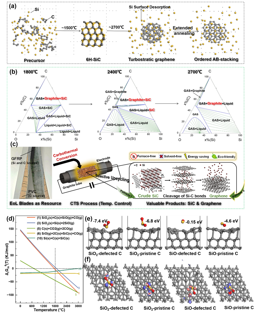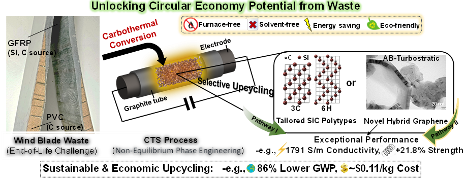 近日,清华大学李金惠教授团队在材料学顶刊 《Advanced Materials》上发表题为“Non-Equilibrium Carbothermal Shock Upcycling: Atomically Precise Synthesis of Tailored SiC Polytypes and Novel Hybrid Graphene from Complex Composites”的论文。本研究采用瞬时碳热冲击(CTS) 技术,利用超快焦耳加热(最高≈3000 K)在毫秒级时间内实现极端高温与非平衡动力学控制,从而将未经分离的退役风电叶片复合材料按需精准转化为多种高性能功能材料。该方法首次实现了从同一废弃物原料中选择性合成不同结构的碳化硅(3C/6H-SiC)和新型杂化石墨烯(AB-turbostratic graphene),其中后者兼具高导电性(1791 S·m-1)与优异力学增强性能(复合材料强度提升21.8%)。结合多尺度表征与模拟,研究揭示了非平衡相演化的原子机制,并通过生命周期评估证明该技术具备显著的环境效益与经济可行性,为复杂废弃物的资源化与高端材料绿色制造提供了全新路径。