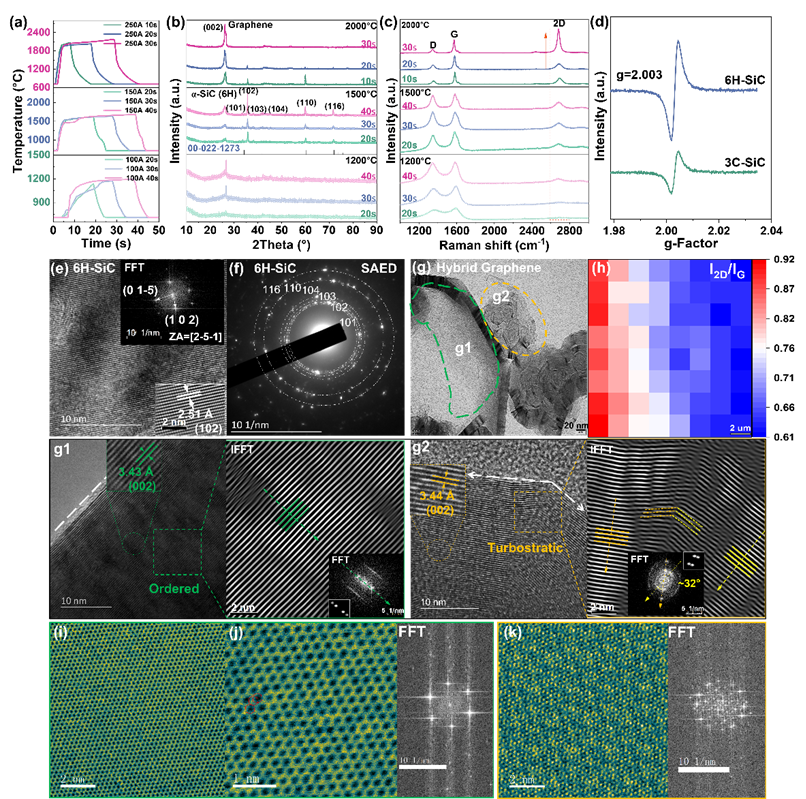 进一步地,研究团队通过延长中温条件下的CTS处理时间,成功合成了亚稳态6H-SiC和新型AB-涡轮层杂化石墨烯。如图2所示,在1500°C下持续加热40秒,可促进硅空位形成,诱导6H-SiC的生成。而在2000°C下延长处理时间至30秒,则能形成具有AB堆叠与涡轮结构共存的杂化石墨烯。高分辨电镜与拉曼谱图分析显示,该材料中约64%的区域为AB堆叠,36%为乱层堆叠。这种结构设计使材料在电导率、热导率和机械性能方面均有卓越表现。