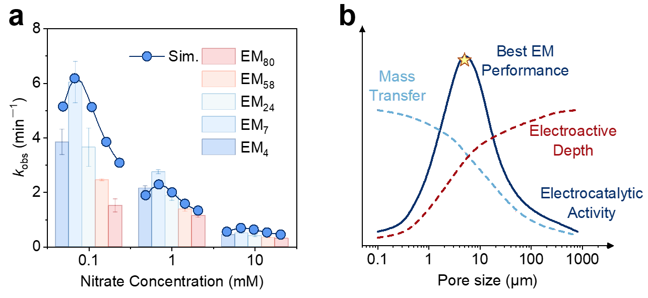 图2. (a)硝酸盐还原模拟与实验的准一级动力学常数对比;(b)限域效应对传质与电子传递的影响机制示意图