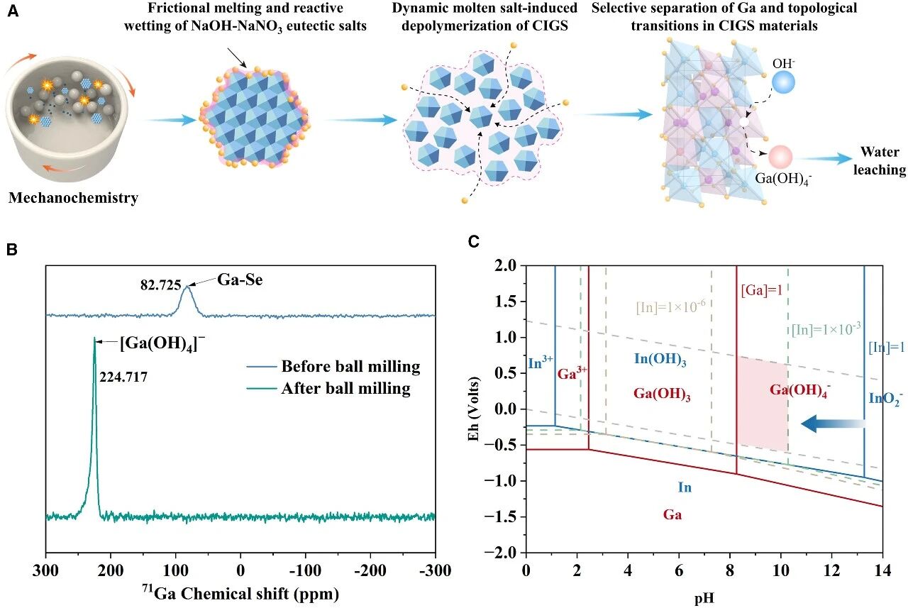 在优化条件(球磨转速700rpm、时间4h、NaOH-NaNO₃摩尔比0.285、熔盐与CIGS质量比0.5)下,该技术实现了96.08%的镓回收率,Ga/In分离因子高达88.89,分别是传统碱浸工艺的35倍、有机萃取工艺的1.4-1.6倍,解决了传统工艺回收率与选择性难以兼顾的痛点。生命周期评估显示,与传统焙烧-浸出-萃取工艺相比,该工艺碳排放量降低70.32%-86.94%,水耗减少87.72%-92.00%,化石资源消耗降低62.91%-81.45%,且体系中的NaNO3可通过蒸发结晶实现高效回收复用,进一步降低环境负担。值得关注的是,该技术已成功扩展至铟镓锌氧化物显示面板废弃物的镓回收,制备的Ga2O3产品纯度超99.99%,同时剩余的CuInSe2固体经后续温和酸浸,可实现铜、铟回收率均超97%,形成“镓优先分离-铜铟协同回收”的全组分利用模式,充分验证了技术的普适性与完整性。