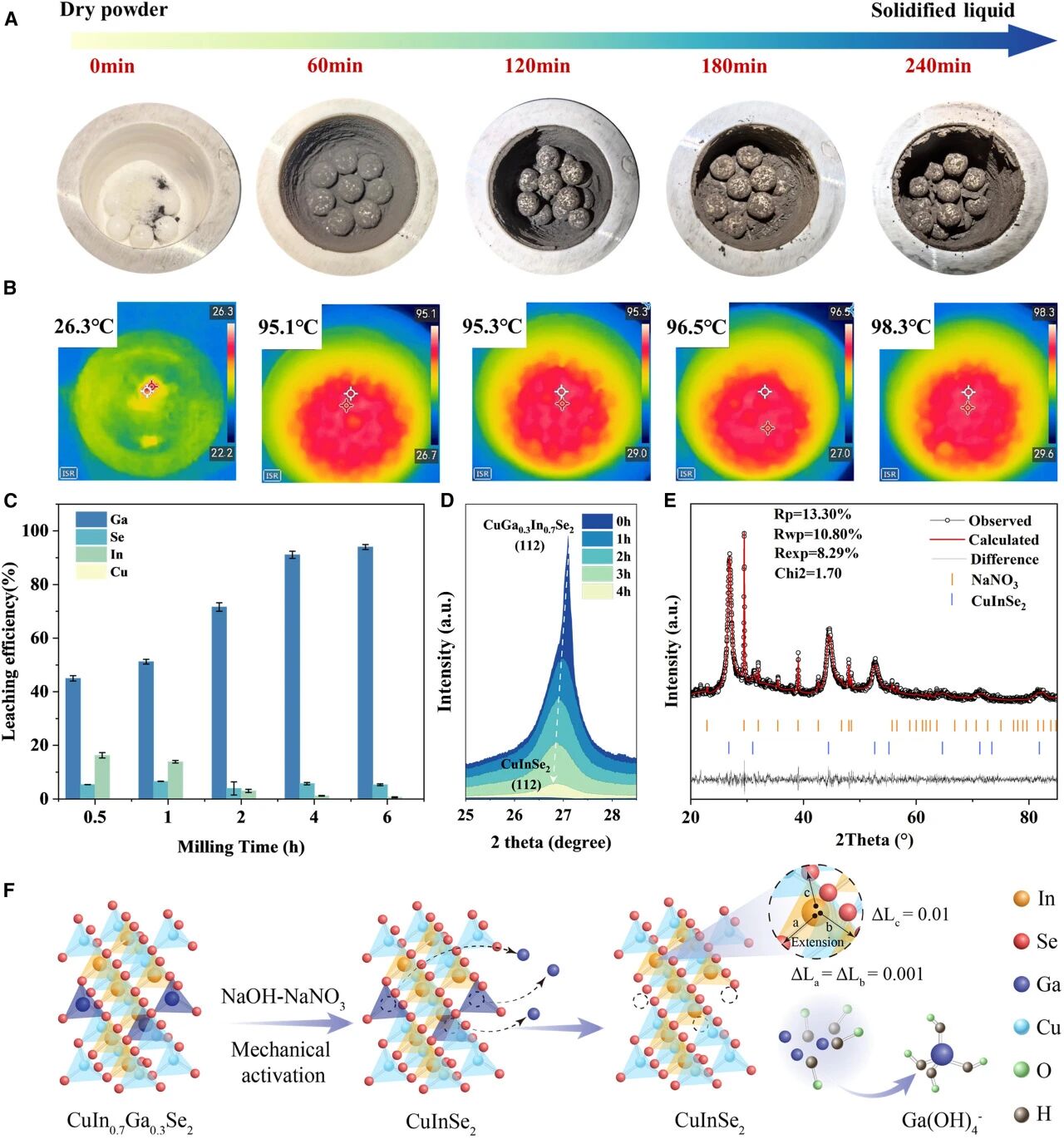 这一策略的核心创新在于“晶格拓扑保留而非破坏”的低熵增设计。共晶盐体系发挥双重关键作用:一方面,提供极化环境,通过离子极化效应选择性削弱Ga-Se键(3.01eV),同时完整保留In-Se键(4.47eV)与Cu-Se键(4.33eV)的稳定性,晶体轨道汉密尔顿布居分析证实,熔盐环境中Ga-Se键的成键强度比空气中降低48.37%,显著弱于同体系中的In-Se键和Cu-Se键;另一方面,通过pH缓冲效应维持体系弱碱性(pH≈8-10),使镓定向转化为可溶性Ga(OH)4-,实现原子尺度精准分离。机械力通过诱导晶格畸变、引入缺陷与构建离子扩散通道,强化选择性反应动力学,避免了传统工艺的无差别晶格破坏与熵增失控,密度泛函理论计算表明,晶格扩张后CIGS晶体总能量提升56.61%,费米(Fermi)能级从7.64eV升至9.25eV,显著增强了Ga原子的反应活性。