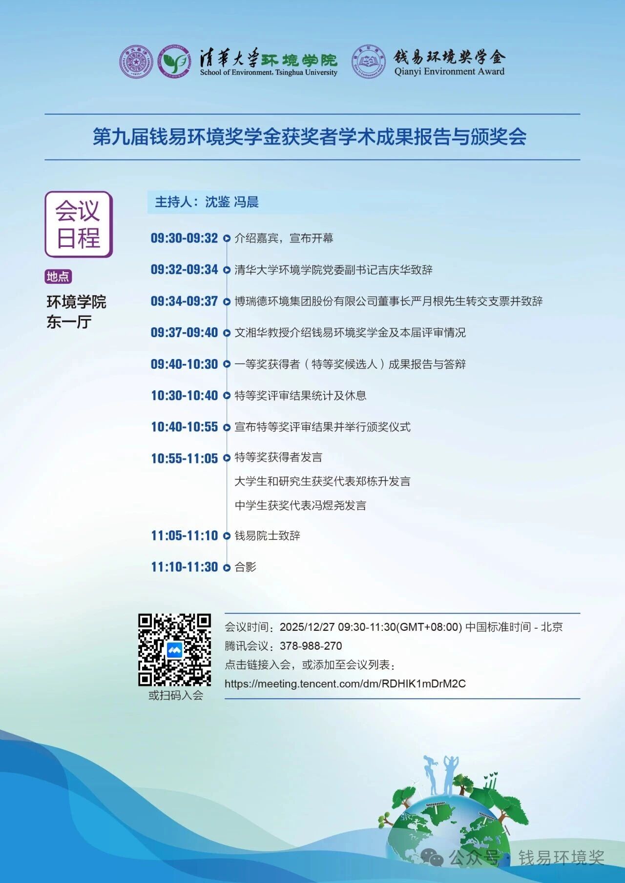 我们诚挚地邀请您参加将于2025年12月27日上午9:30在北京清华大学环境学院东一厅举行的“第九届钱易环境奖学金获奖者学术成果报告与颁奖会”(日程附后,不能现场参会的老师同学可以线上参会)