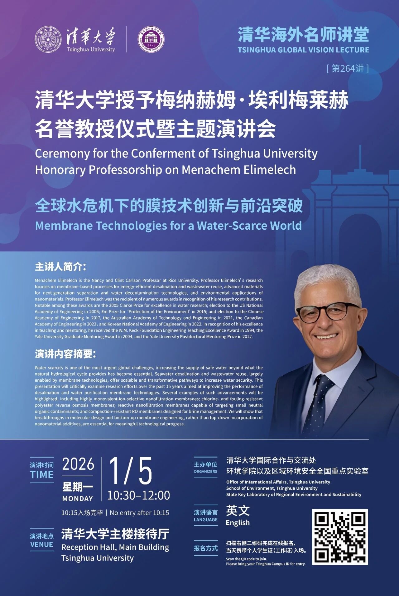 清华大学国际合作与交流处和环境学院以及区域环境安全全国重点实验室将于2026年1月5日联合举办清华大学授予梅纳赫姆·埃利梅莱赫名誉教授仪式暨主题演讲会。本次活动特邀莱斯大学梅纳赫姆·埃利梅莱赫教授(Menachem Elimelech),就“全球水危机下的膜技术创新与前沿突破”作专题演讲。诚邀广大师生参与。