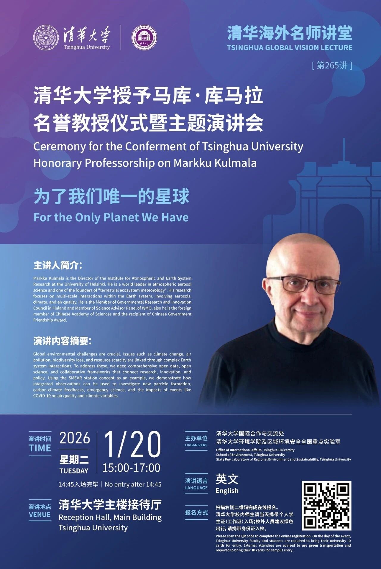 Join the Ceremony for the Conferment of Tsinghua University Honorary Professorship on Markku Kulmala on January 20th! Organized by the Office of International Affairs, the School of Environment and the State Key Laboratory of Regional Environment and Sustainability, this special event features a lecture by Prof. Markku Kulmala, Director of the Institute for Atmospheric and Earth System Research (INAR) at the University of Helsinki.
