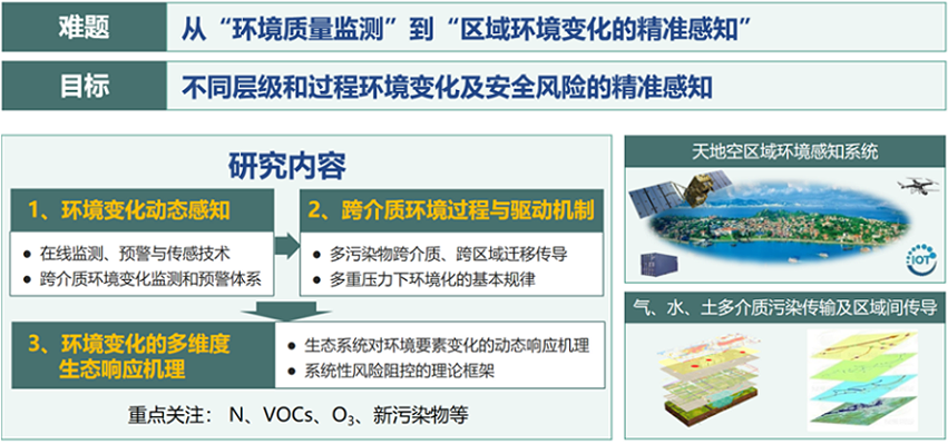 以传统环境质量监测为基础,建立区域环境变化与风险的精准感知体系;构建跨介质过程模拟大科学装置,研究多介质复合污染综合性和系统性的环境变化过程与驱动机制;揭示多维度不同层级的生态响应机理,构建人类活动和自然交互作用导致的环境变化和安全风险的精准感知 体系。